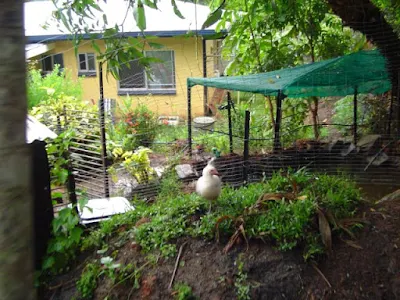 Tässä yllä kuva, joka saadaan kun edellisen kuvan ottamispaikassa käännytään 45 astetta oikealle. Eli katsotaan kanatarhasta ankkatarhan ja -lammikon yli kohti taloa. Tuo vihreä verkko on pingotettu lammikon ylle estämään mangoja putoilemasta lammikkoon. Ensimmäiset mangot omassa puussa alkavat olla jo kypsiä. Tuossa vasemmalla, kanakopin nurkalla kiipeää ylös päin jälleen yksi passionhedelmäköynnös. Se on kasvanut paikalla jo ennestään, joten emme tarkemmin tiedä, mikä lajike se on. Näyttää villiltä, joka tekee vain pienenpieniä pahanmakuisia hedelmiä. Että miksikö näin paljon passionhedelmää? Se nyt vain sattuu kasvamaan täällä hyvin. Luffan ja sen lisäksi en oikein keksi muuta köynnöskasvia, jota voisin istuttaa. Yksi- tai kaksivuotisia tietysti olisi, vaikkapa pavut. Niitä yritin Woodstockissa, mutta eivät lähteneet kasvamaan. Taisivat kanat syödä ne heti alkuunsa.